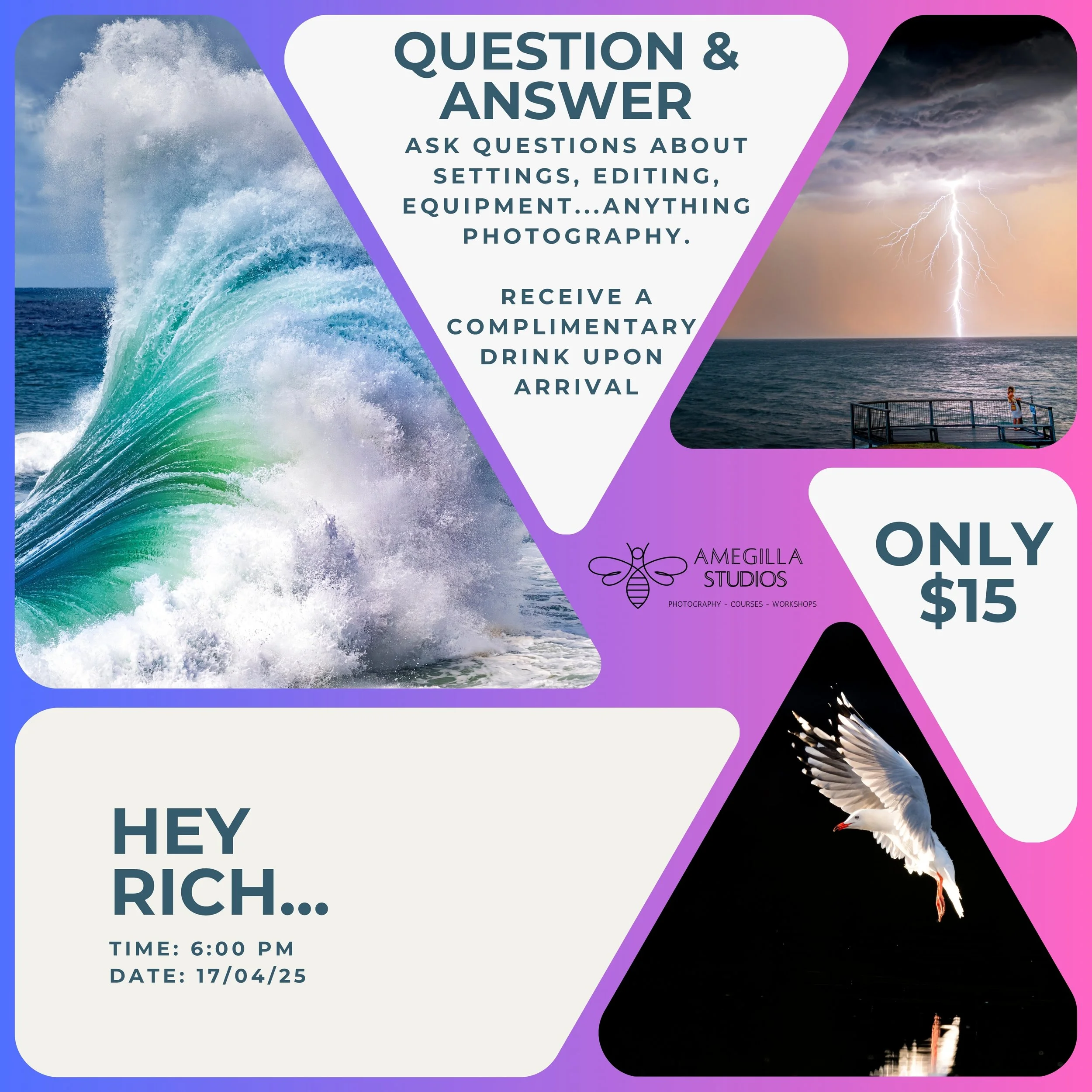 Social Photography Social Saturday Shoots $15.00 Add To Cart Added! Photography Critique Night $15.00 Add To Cart Added! Hey Rich... $15.00 Add To Cart Added! Holiday Snaps $15.00 Add To Cart Added! Saturday Shoots Package Deal Sale Price: $120.00 Original Price: $150.00 Sale Add To Cart Added! Photography Critique Night Package Deal Sale Price: $60.00 Original Price: $90.00 Sale Add To Cart Added! The Whole Package Sale Price: $165.00 Original Price: $330.00 Sale Add To Cart Added!
